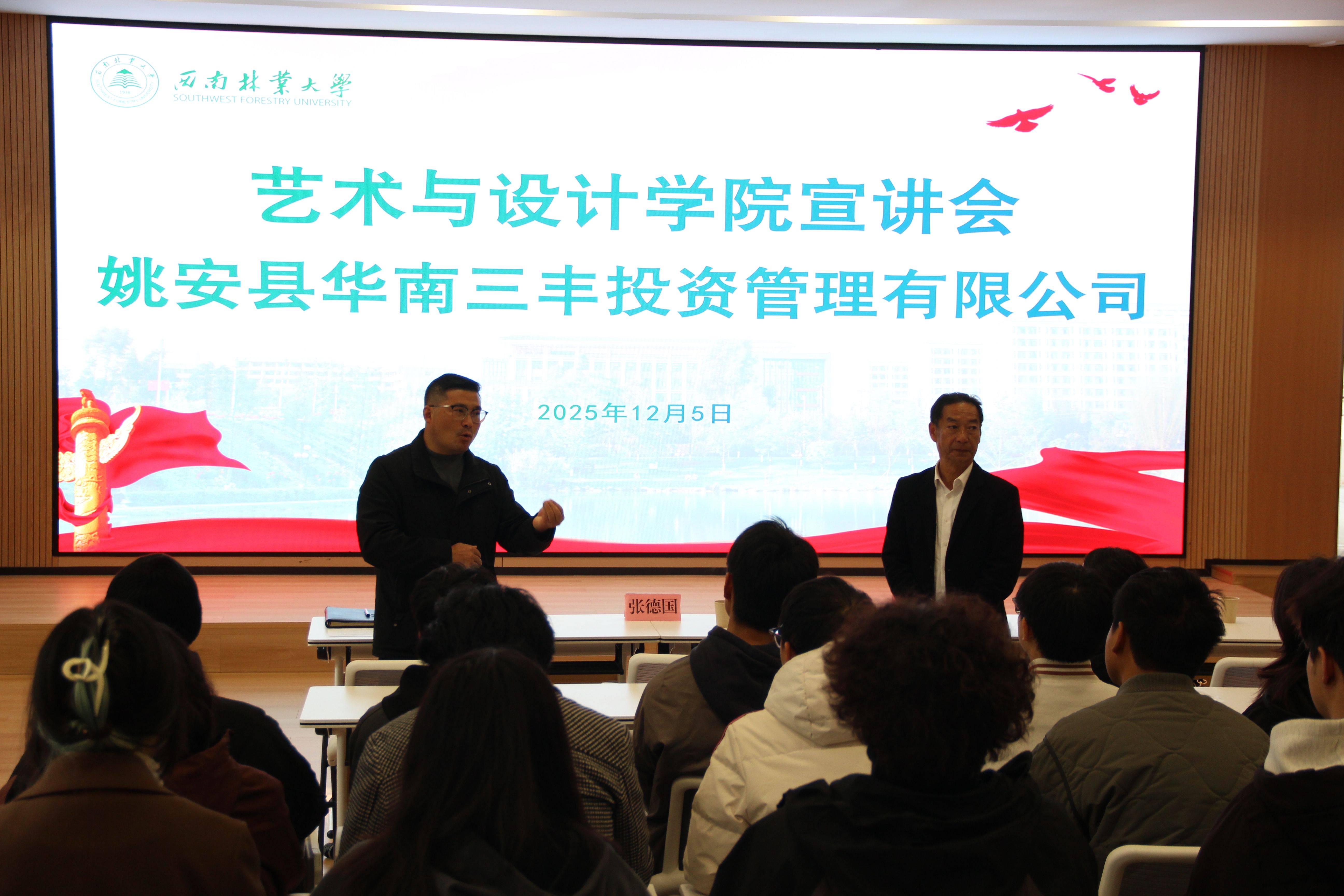 12月5日上午,由艺术与设计学院主办的姚安县华南三丰投资管理有限公司校园招聘专场宣讲会在设计楼106举行。学院党委书记张德国、党委副书记李浩、公司总经理陈远峰一行及2026届毕业生共80余人参会。宣讲会由李浩主持。