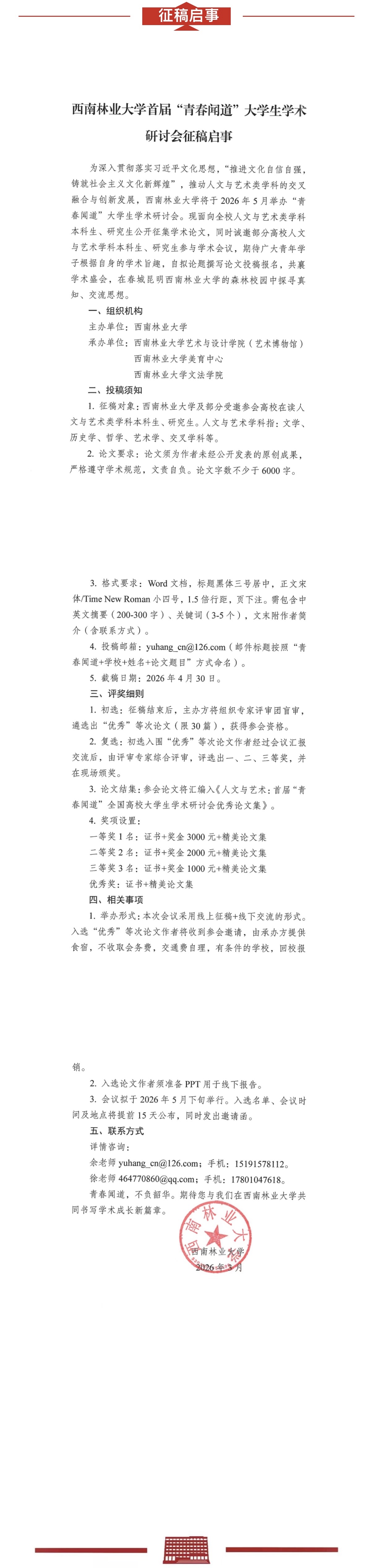 关于2026年西南林业大学首届“青春闻道”大学生学术研讨会征稿启事